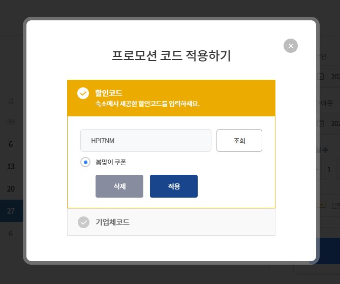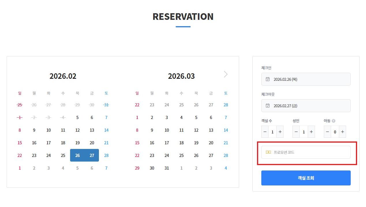 홈페이지 예약 한정 봄맞이 할인 이벤트 페이지 정보 작성자 Y resort 댓글 0건 조회 749회 작성일 25-12-19 20:07 목록 본문 2월 쿠폰입니다.홈페이지 예약시, 프로모션 코드에HPI7NM를 입력하시면 추가 할인이 가능합니다!(복사-붙여넣기 하시면 됩니다)(아래를 참조하시고 객실 조회시 자동으로 할인가가 적용됩니다) 다음글무료 물품 대여 19.10.22